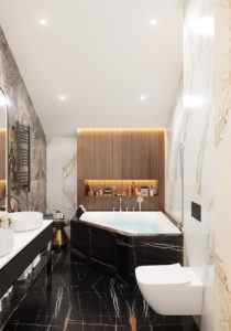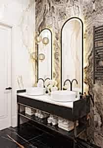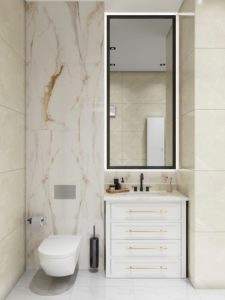 Для создания Pin Up интерьера отлично подойдет дизайн ванной комнаты с белым мрамором. Этот материал подчеркивает роскошь и придает помещению изысканный вид. Дизайн ванной комнаты под мрамор в более доступных вариантах может быть выполнен с использованием качественной плитки, имитирующей натуральный камень.
